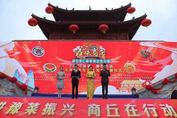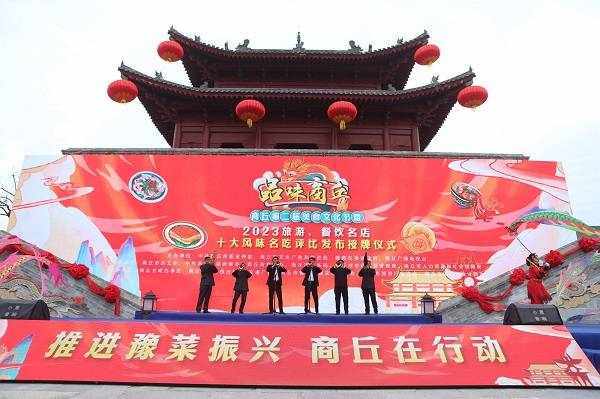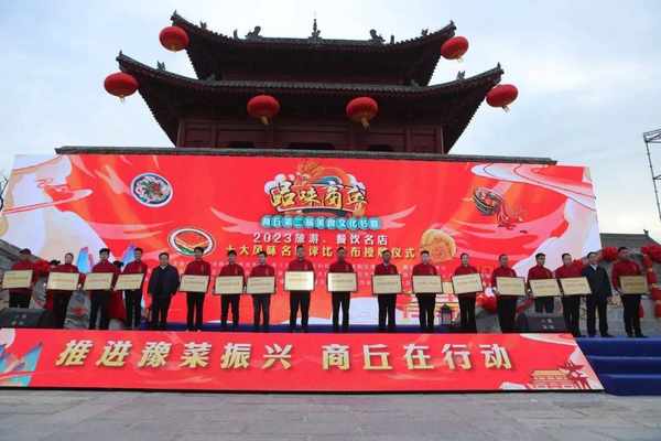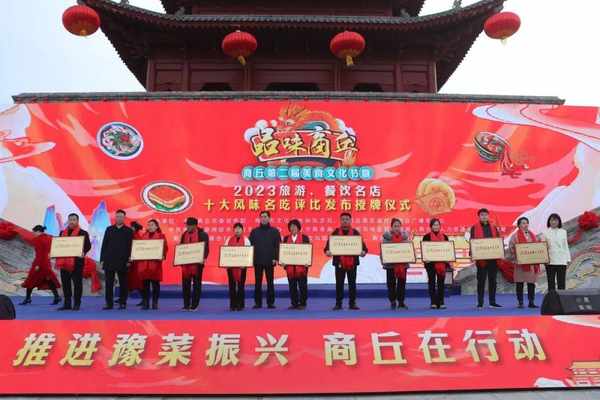 2月21日,商丘市第二届美食文化节暨2023旅游、餐饮名店“十大风味名吃”评比发布授牌仪式在商丘古城举行。河南省文化和旅游厅副厅长曲径,商丘市委副书记、市长摆向阳,市人大常委会主任张家明,市政协主席楚耀华,市委常委、宣传部长王全周,市人大常委会副主任姬脉常、刘北京,副市长王爱林,睢阳区委书记孙景权等参加活动并为上榜的酒店和风味名吃授牌;河南省文化和旅游厅文明办常务副主任李国永,省餐饮与住宿行业协会副会长、秘书长宋春亭,省餐饮与住宿行业协会驻会副会长张毅兵参加活动。