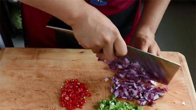 3.接下来,红辣椒切成小圈,洋葱切成葱花,洋葱切成小方块。