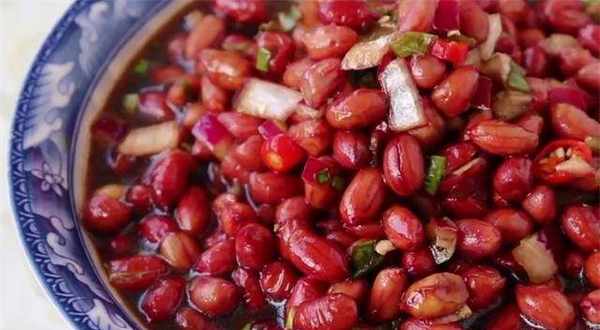 红皮花生、食用油、红辣椒、葱花、洋葱、食用醋、糖、盐、生抽