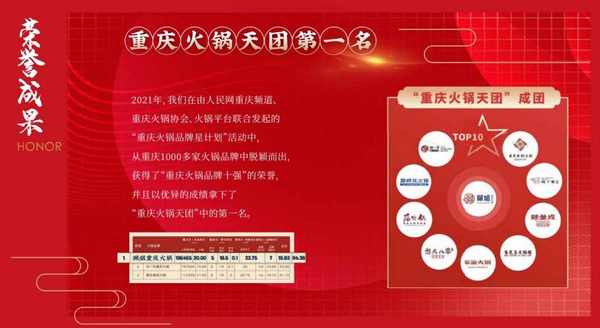 重庆火锅天团第一名,将珮姐10年来,坚守重庆火锅本味,走向全国的团体拼搏力与品牌坚守力印刻其中。