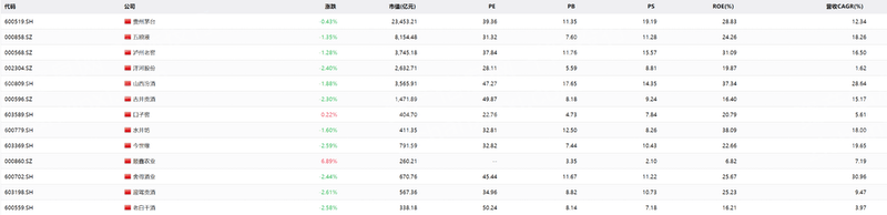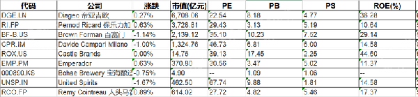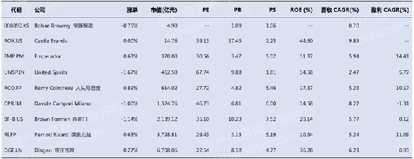 全球非中国主要企业有帝亚吉欧[DEO.N]、星座品牌-B[STZ_B.N]、百富门(BROWN FORMAN)-B[BF_B.N]、DUCKHORN PORTFOLIO[NAPA.N]、MGP INGREDIENTS[MGPI.O]、维拉美特酒庄[WVVI.O]、EASTSIDE DISTILLING[EAST.O]、SCHLOSS WACHENHEIM[SWA.DF]、BERENTZEN-GRUPPE[BEZ.DF]、帝亚吉欧[GUI.DF]、帝亚吉欧[DGE.L]、保乐力加[0HAT.L]、REMY COINTREAU ORD SHS[0MGU.L]、C&C[CCR.L]、STOCK SPIRITS[STCK.L]、宝控股[2531.T]、保乐力加[RI.PA]、金巴利[CPR.BSI]、HITE JINRO[000080.KS]等。