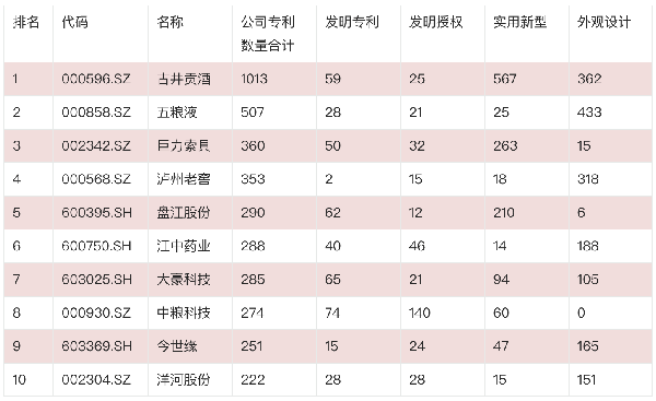 表 国内专利排名前十白酒公司