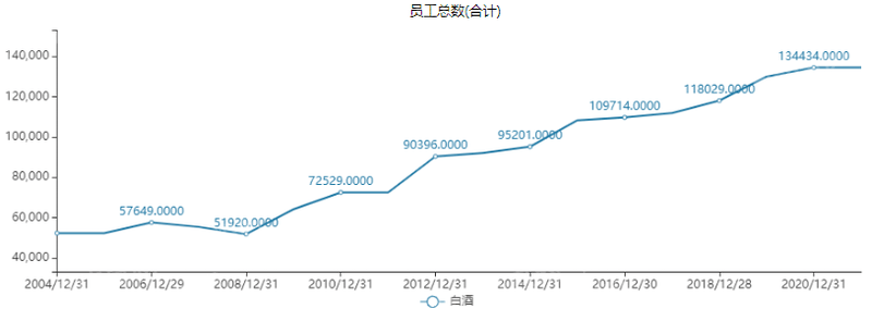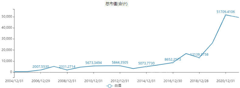 自2004年以来,白酒板块成分股个数不断增加。据万德统计,截止2020年12月31日,白酒板块有18家上市公司。员工总数不断攀升,目前已突破13万人。白酒板块总市值也是逐年增加,截止2020年12月31日数据,总市值已达51709.4106亿。