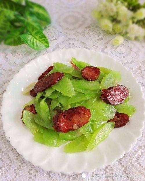 4、再倒入莴笋快速翻炒即可关火出锅,不用另外放盐,腊肠里已含有咸味。