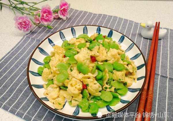 3、起锅烧热倒油,油热后放入鸡蛋液摊开,要凝固时滑散,鸡蛋推到锅的一边,倒入蚕豆瓣翻炒颜色变绿,再将鸡蛋一起混合翻炒;