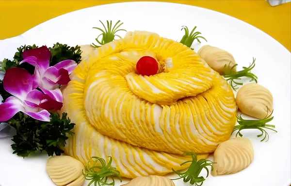 10、炒锅烧热,加入鸡汤50毫升、盐、味精勾芡,倒入熟油脂10克,淋在蛋卷上,摆上花饰即可上桌;