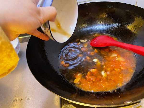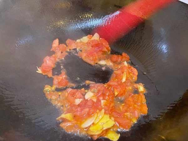 制作方法5、西红柿下锅炒熟,有酸味