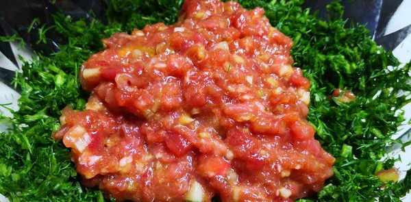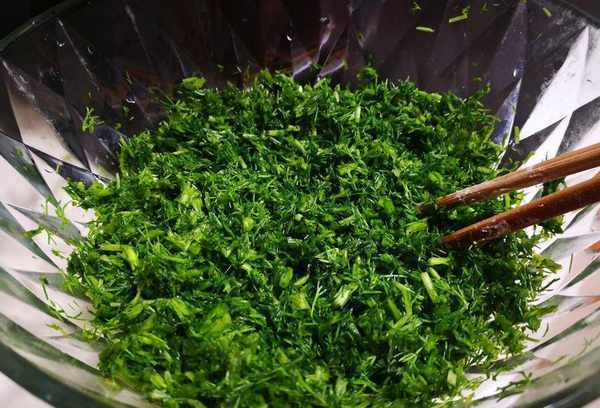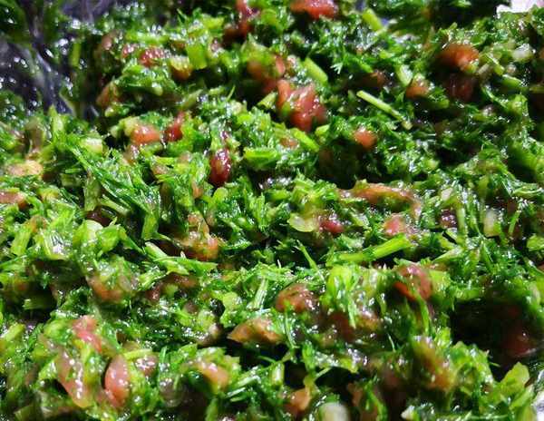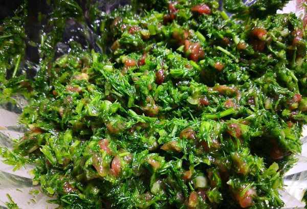 浸泡后,冲洗两遍,将粗糙难吃的根切掉,然后放在布上检查水分,然后切碎放入大碗中,加入适量的洋葱油,拌匀。并丢弃使用。