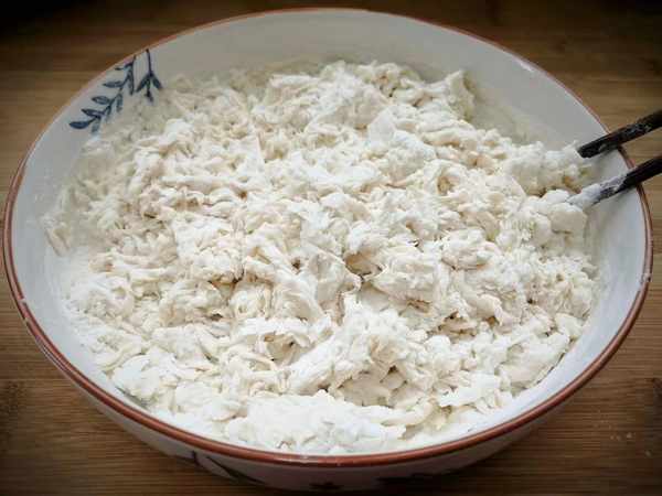 2、用筷子把面粉搅拌成面絮状,最后再下手揉成一个柔软一点的面团,做水煎包的面要和稍微软一些。
