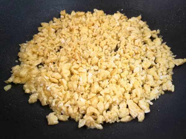 6、准备2个鸡蛋打入碗中加少许盐,把鸡蛋液搅散,炒锅里倒入适量油,蛋液倒入锅中,鸡蛋液定形炒成鸡蛋碎盛出。