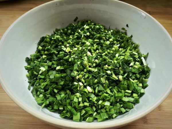 5、一把韭菜洗净水分控干,把韭菜切成小碎粒,韭菜切好后放入盆中。加入一勺食用油搅拌均匀,锁住水分备用。