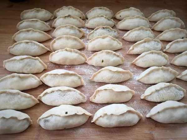 8、在案板上撒上一些面粉, 取出发酵好的面团,搓揉一会再搓长条,切成比饺子剂子大一些的面剂,按扁,用擀面杖擀厚面皮,放上馅料,面皮对折起来,把口封严,包好后二次醒发10分钟。