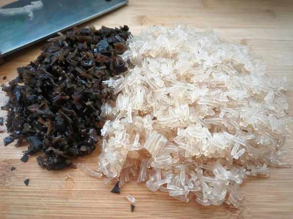 4、木耳和粉条提前用凉水泡发,木耳在开水中焯水5分钟捞出,切成小丁,泡发好的粉条有点硬,再开水中烫一分钟捞出,用刀切成小段。