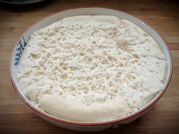 3、面团揉好了,盖住让它发酵到原来的2倍大,23个小时以后面团已经发酵好了,用手扒开面团,里面全是蜂窝眼面发酵的很好。