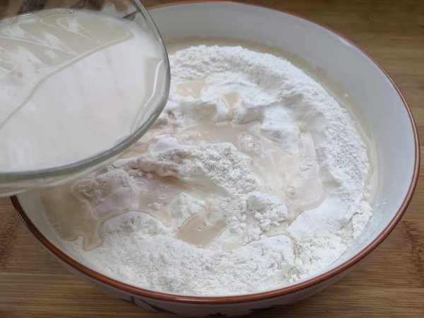 1、准备面粉500克,加入一小勺糖混合均匀,然后在一碗温水里加入5克酵母粉搅拌化开,酵母水慢慢加入面粉中,分次少量的加入水来和面,一边倒一边搅拌。