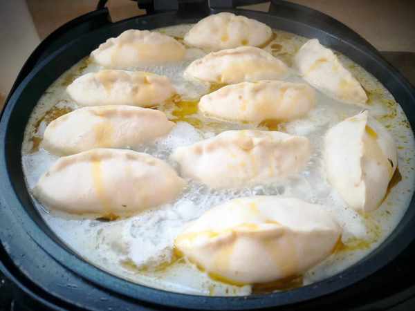9、我们做一个面粉水,面粉和水的比例是1:10,面糊一定要稀,电饼铛通电加热以后刷上一层食用油 ,把煎包放在电饼铛里 ,摆放的时候之间要留有空隙,盖上锅盖慢煎,煎至底部金黄,用勺子加入调好的面粉水,水要没过煎包的三分之二处,盖上盖子慢煎。