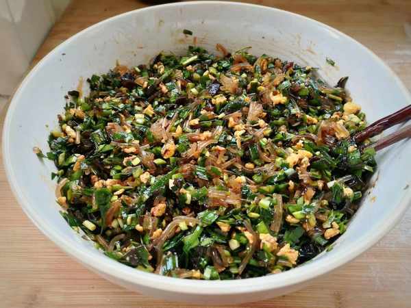7、韭菜中加入切好的木耳,粉条鸡蛋碎,加入少许盐、蚝油、老抽,芝麻香油,用筷子搅拌均匀,不需要加太多调料,会掩盖韭菜的鲜味。