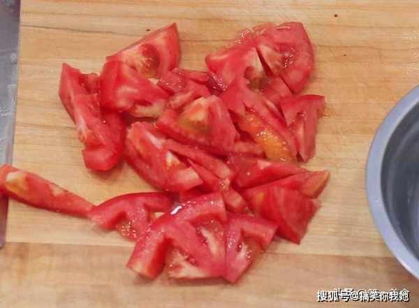 西红柿一个,切去根部,切成小块放在盆中。