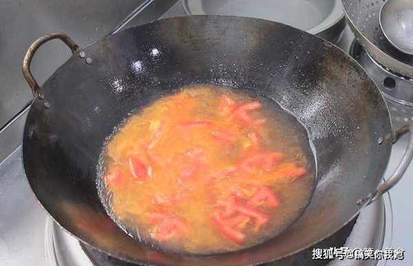 下面,我们开始烹饪,锅内烧油,倒入西红柿翻炒,翻炒出西红柿的汁水以后,加入适量的清水,把水煮开。