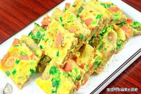 2分钟以后面糊已经基本定型,在上面淋一半蛋液,盖上锅盖再烙1分钟,烙至蛋液全部定型我们把它翻过来,然后把剩余的蛋液倒在上面继续烙1分钟,时间到再次翻面,保持小火大约烙制5分钟,烙制蛋液全部定型,表面成金黄色时即可出锅。吃的时候切成小块,随吃随取,随时补充能量。