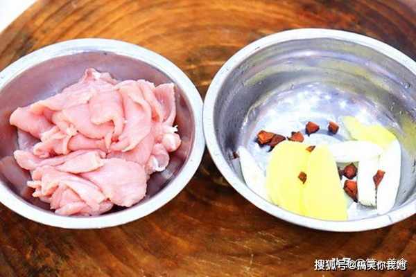 首先,我们准备猪里脊肉300克,把上面的肥肉和筋膜去除干净,肉松要用纯瘦肉来做,筋膜和肥肉会影响肉松成型,然后顺着里脊肉的纹理,切成均匀薄片,这样肉片更容易炒散、炒成丝状;大葱切成马蹄片,生姜切成片,再抓入一粒八角;接着我们调一个碗料:碗中放入生抽5克,食盐2克,白糖4克、蚝油3克、再倒入植物油10克,把调料搅散备用。