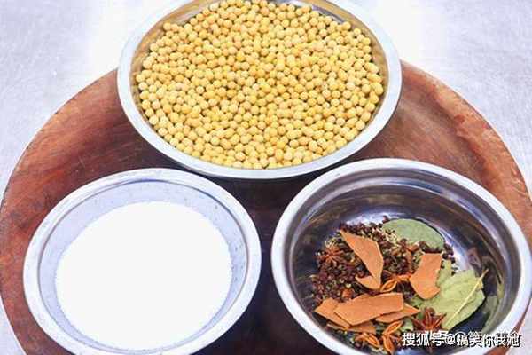 首先,我们准备黄豆500克,提前洗干净、晾干水分;准备一个小碗,放入几片香叶、一小撮小茴香、几粒八角、一小撮花椒和两节桂皮;另外多准备点食盐,用来炒黄豆。