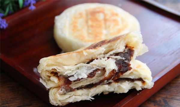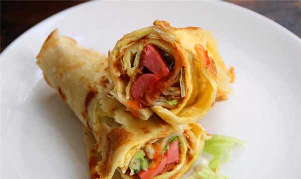 7、把蛋糕翻过来继续煎,直到蛋糕两面金黄,然后取出蛋糕,用同样的方法煎剩下的蛋糕。烤好后可以直接食用,还可以增加口感。然后炒火腿肠,放切碎的生菜、酱汁、酱油、甜面酱、泰式甜辣酱等。把馅饼包起来,就可以吃了。
