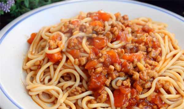 7、将面条放入大碗中,加入准备好的番茄肉酱,拌匀,浓郁的酱汁、酸甜的番茄肉酱面就做好了。