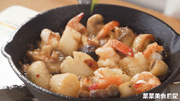 橄榄油不要少放。这道菜主要是将蒜末泡在油里,炒出香味,让海鲜和香菇有蒜油的味道。