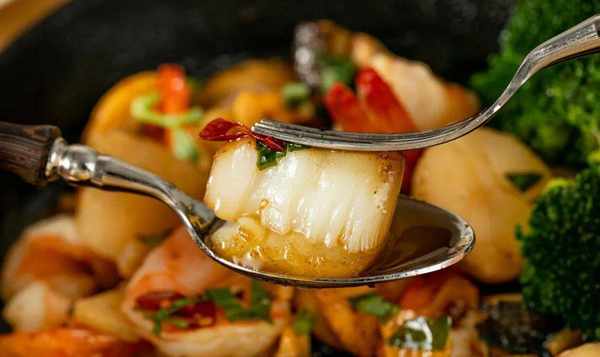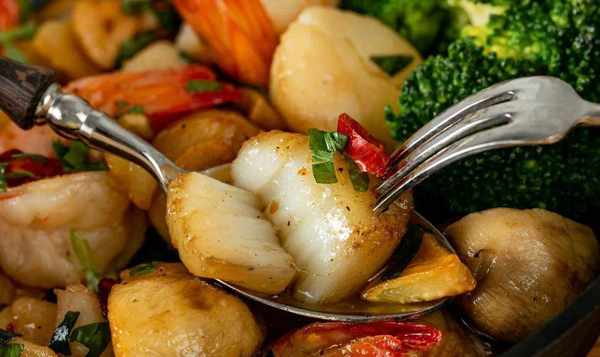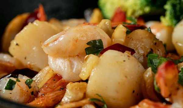 除了扇贝,我还加了虾、蘑菇和西兰花。