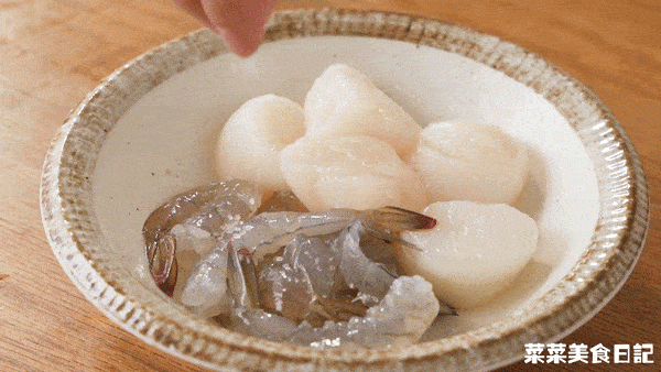 1.加入1/2茶匙盐和1/2茶匙黑胡椒,将鲜虾和扇贝腌一会儿,去掉虾线