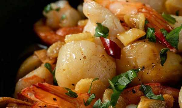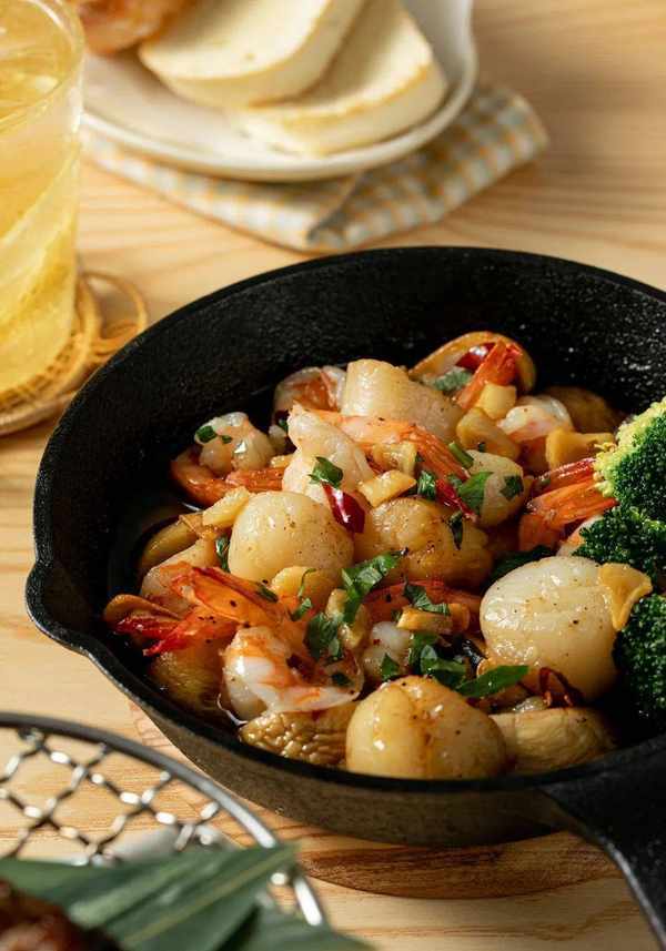 扇贝5只、鲜虾8只、香菇10朵、蒜头1瓣、干辣椒1-2条、香菜少许、盐2茶匙、黑胡椒粉1茶匙、辣椒粉1/2茶匙、橄榄油100克