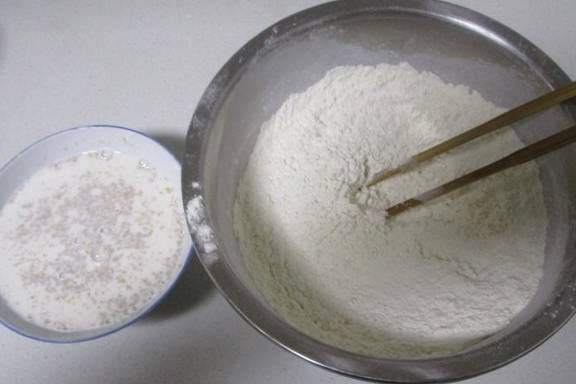 面粉里加入盐,糖拌匀,牛奶隔水加热至38度左右,用手指探不会烫手就好倒入酵母拌匀