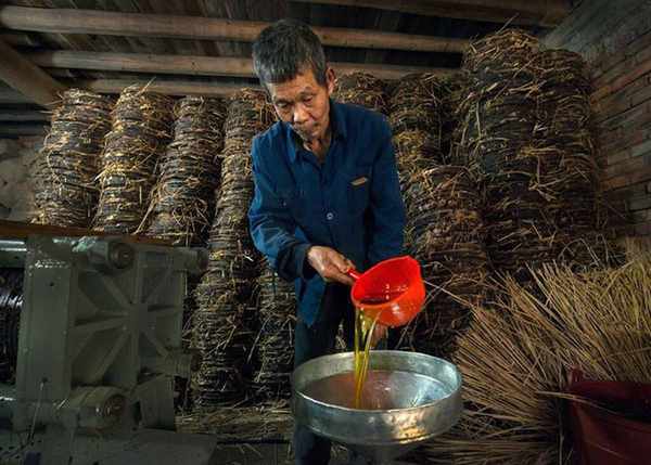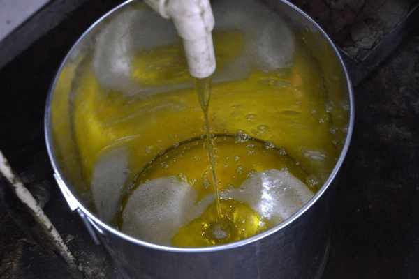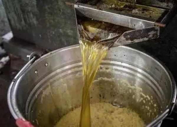 第三,就是过滤。刚出来的花生油,因为混杂着花生而呈现糊状,这时候就要经过几遍过滤,把里边的杂质筛出来,剩下的就是喷香明澈的花生油了。这些油真是纯天然无污染,一丁点添加剂都没有。