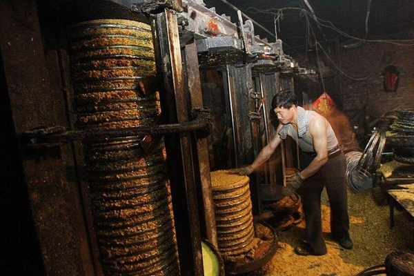 当花生炒到7成熟时,就进入榨油过程,靠着纯物理性质的挤压,把花生里的油榨出来。以前的时候都是人工榨油,光膀子的男人们在油坊里用大锤敲击压杆,现在当然都是机器操作,开关一按等着接油就行了。