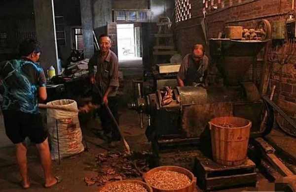 其次,榨油之前要先把花生破碎,然后放到专门容器里去炒。炒过的花生出油率高而且香,当然也可以不炒,那就是生榨油或冷榨油,这样出油率低而且不如炒过的香,但相对而言更健康一点。