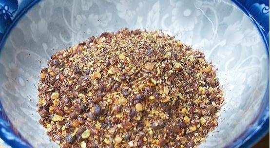 香料烤好后,倒入锅中冷却。将粗棉布放在砧板上,将冷却后的酸枣仁倒在粗棉布上,用叉子捣碎,盛入碗中待用。
