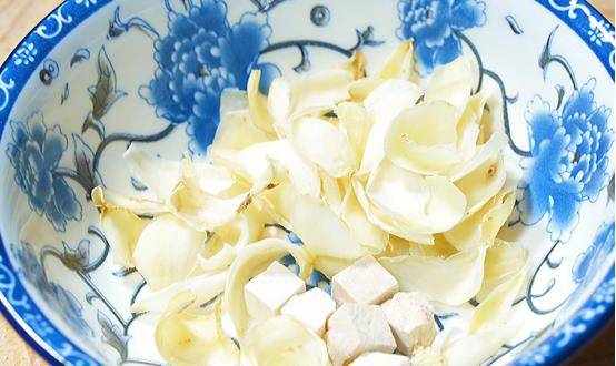 准备一把干百合,五六块茯苓放入大碗中,加入清水,清洗干净后捞出,沥干水分备用。