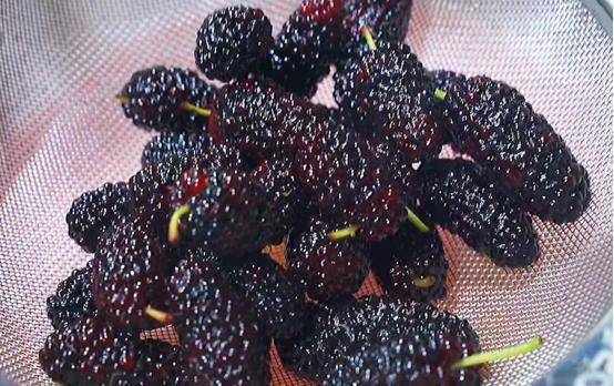 准备七八个剥好的桂圆,一把新鲜的桑葚放入碗中,加入一勺食盐,适量清水清洗干净,洗净后捞出备用。
