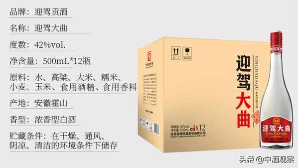 这是安徽迎驾贡酒出品的迎驾大曲,原料中同样有食用酒精、食用香料。目前,白酒中是可以添加食用酒精、食用香料的,2022年8月1日以后生产的白酒,就不可再添加食用香料了,即使添加食用酒精,也需要使用粮谷酿造的食用酒精。