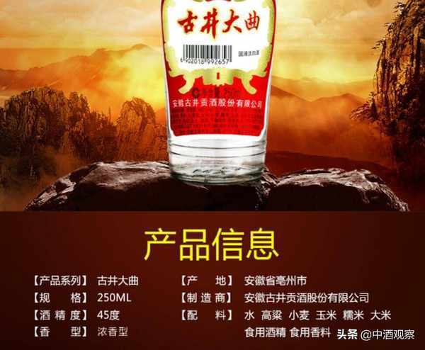 仔细看上面这款古井大曲的产品信息,由安徽古井贡酒股份有限公司出品,配料:水、高粱、小麦、玉米、糯米、大米、食用酒精、食用香料。这个古井大曲还算有良心,并没有刻意隐瞒,而是在标签上醒目地标了“固液法白酒”五个字。