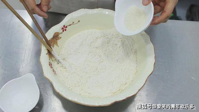 倒入普通面粉400克, 细沙糖15克,食用盐1克,