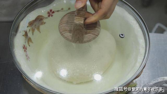 30分钟以后,面团还没完全发酵好,这个时候我们掀开锅盖,