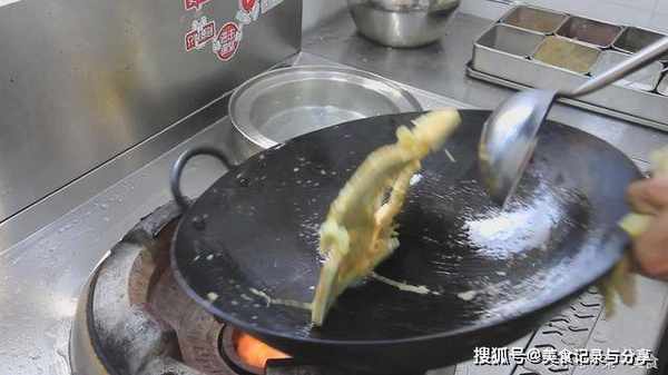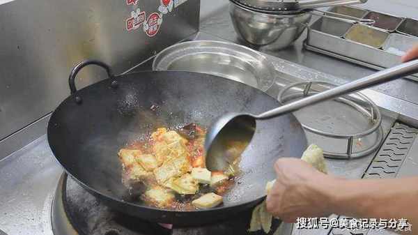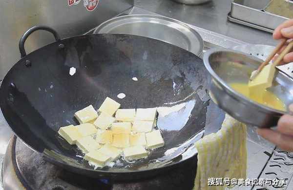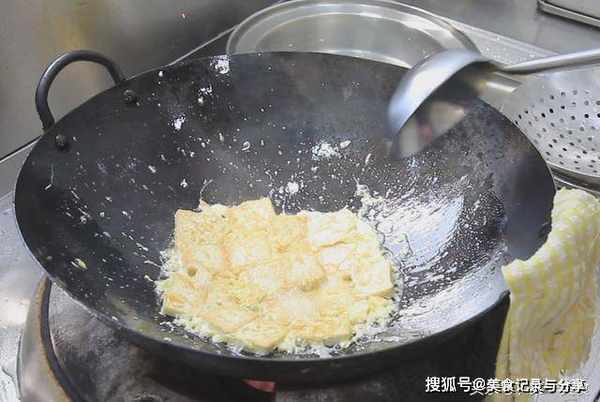 豆腐的一面煎黄以后,来个小翻,由于豆腐比较薄,最好是采用抛锅法,免得把豆腐翻烂。