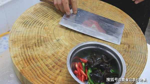翻炒出红油,放入青线椒、小米椒和木耳继续翻炒。