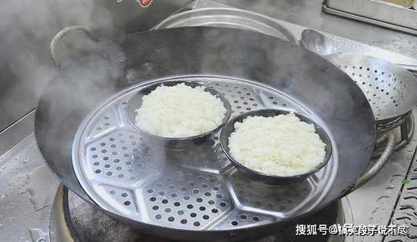 十五分钟以后,另拿一个盘子扣在小碗上面,翻过来拿走小碗,一盘扣碗米饭就呈现在我们眼前,这个时候先不要急着吃。