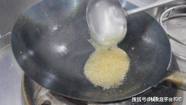 锅底稍微留一点油,放入一大勺白糖,然后加入清水,用勺子不停的搅拌,化开白糖随着温度的升高,会起很多泡泡,这个时候一定要有耐心,一直保持中小火,不停的搅拌糖汁,等待糖汁变为金黄色,当它变色的时候,大泡会转为小泡。