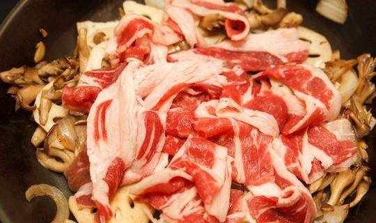Step4.等到牛肉片约5分熟食加入砂糖、酱油、味醂、米酒调味。