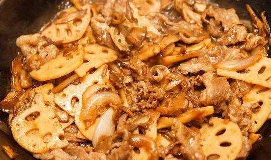 舞菇100g、牛肉片300g、莲藕150g、洋葱丝1/4颗、大蒜2瓣、辣椒1根(可省)、青葱丝少许(可省)、砂糖1/2大匙、酱油1.5大匙、味醂1.5大匙、米酒1大匙