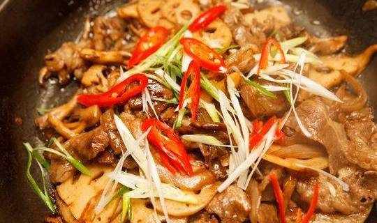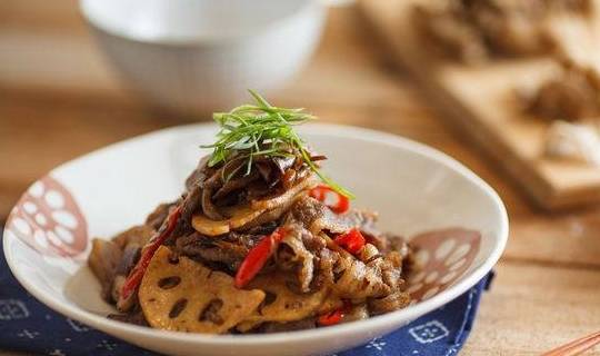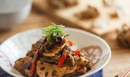 Step3.倒入莲藕片稍微拌炒后加入牛肉片。